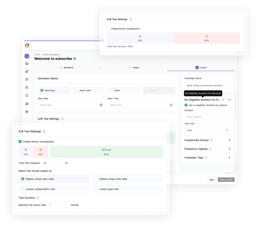 Manual A/B testing requires you to set up variants, wait for statistical significance, interpret results, and manually promote the winner — a process that takes days and often gets skipped under time pressure. FosterFlow’s intelligent A/B testing automates the entire cycle: variant creation, traffic allocation, significance detection, and winner deployment.