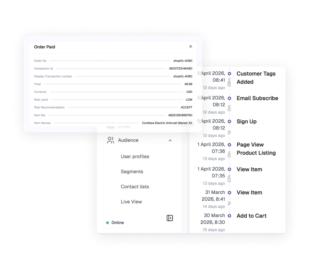 Pull existing Shopify Saved Segments for instant targeting and write back engagement data as Customer Tags for centralized data management.